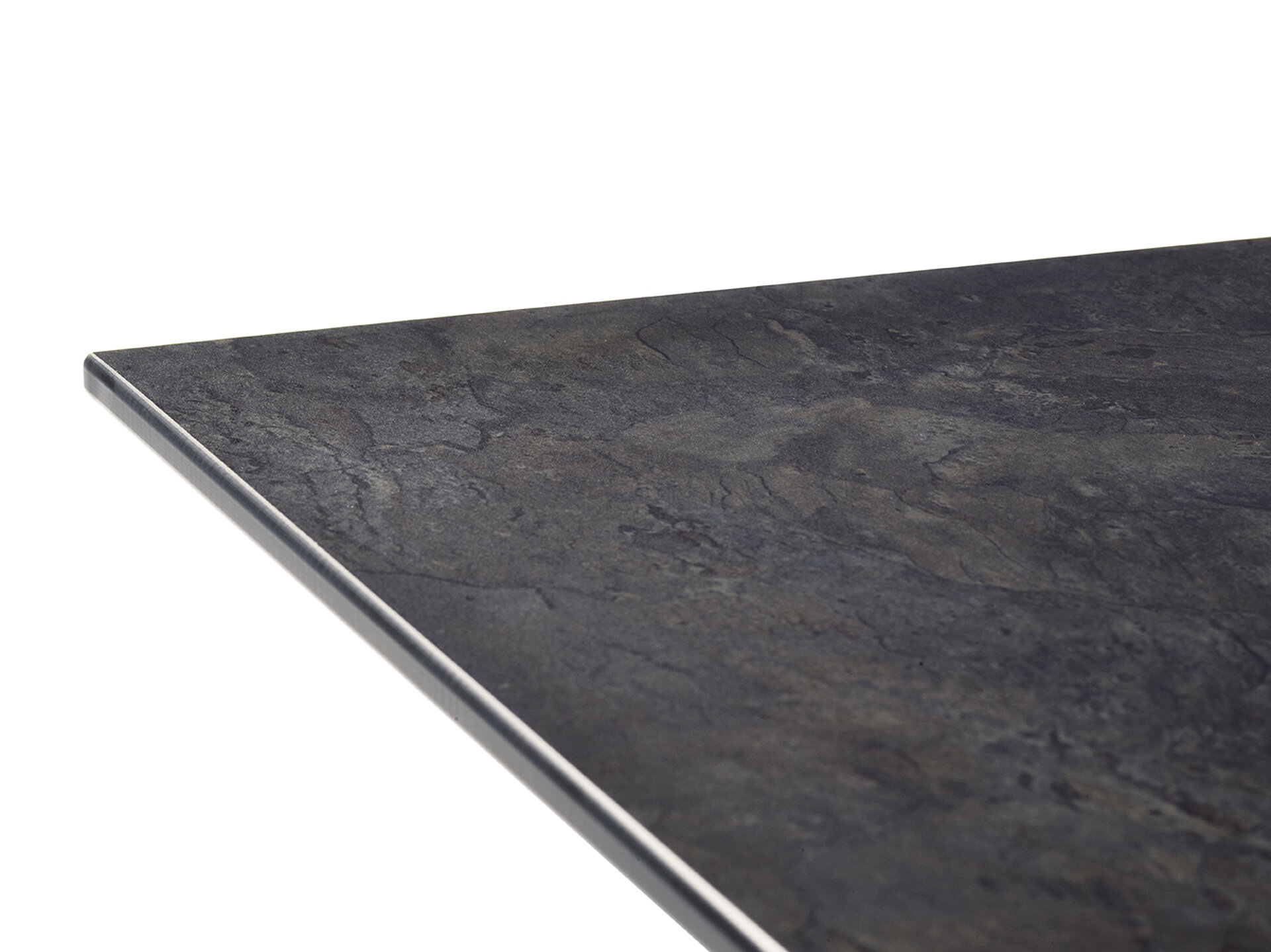 Die 10 mm starken hochwertigen Polytec®-Tischplatten in den Dekoren Schiefer anthrazit und Beton hell sind duromere Hochdrucklaminate (HPL) mit einem äußerst wirksamen Witterungsschutz und daher bestens für den Outdoor-Bereich geeignet. Ihr modernes Styling erhält die Platte durch die abgeschrägte und farblich angepasste Kantengeometrie.